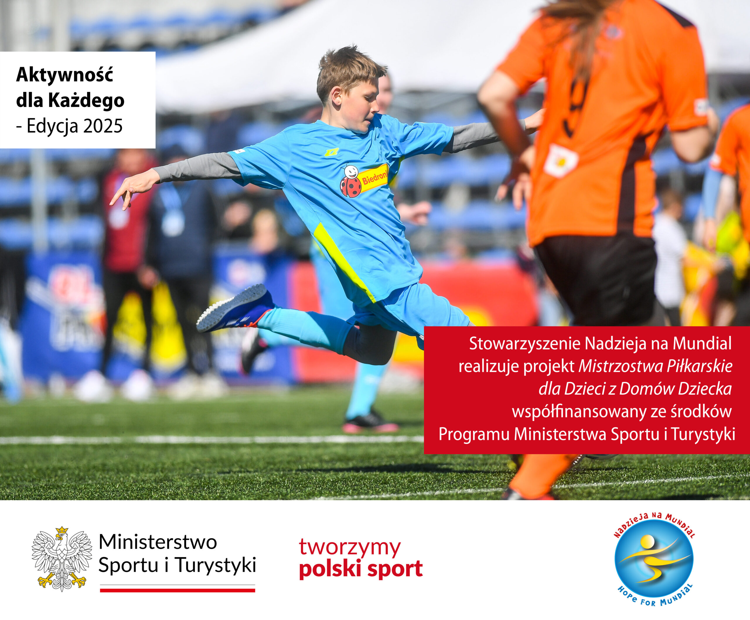 Stowarzyszenie Nadzieja na Mundial realizuje projekt Mistrzostwa Piłkarskie dla Dzieci z Domów Dziecka współfinansowany ze środków Programu Aktywność dla Każdego – Edycja 2025 Ministerstwa Sportu i Turystyki.